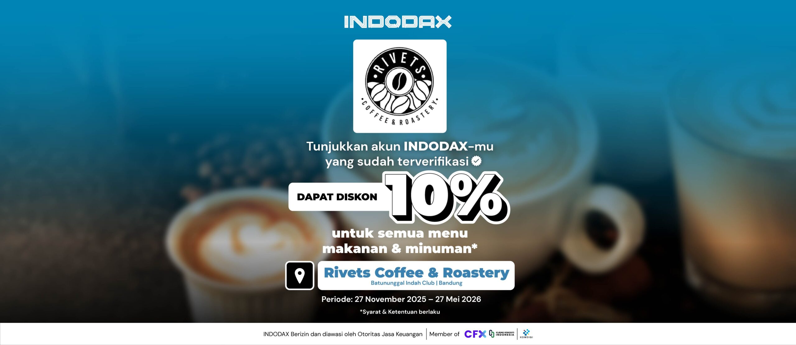 Nikmati promo spesial dari INDODAX di Rivets Coffee & Roastery! Tunjukkan akun INDODAX-mu yang sudah terverifikasi untuk dapatkan diskon 10% untuk semua menu makanan & minuman dengan minimum order Rp. 100.000. Berlaku hingga 27 Mei 2026. Lokasi: Jl. Batununggal Indah IX No.2, Mengger, Kec. Bandung Kidul, Kota Bandung, Jawa Barat 40266.